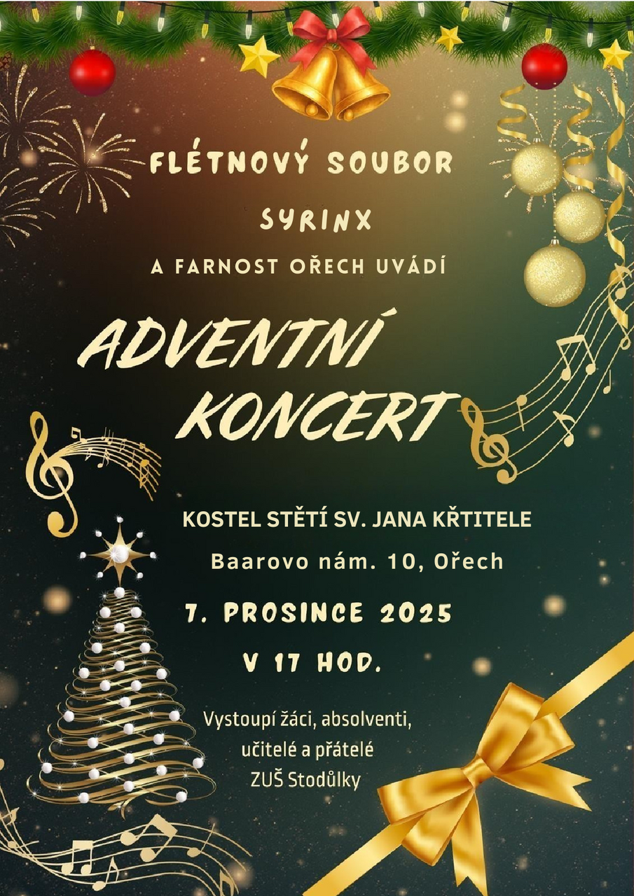 Farnost Ořech a flétnový soubor Syrinx vás srdečně zvou na adventní koncert, který se uskuteční 7. prosince 2025 od 17:00 v kostele Stětí sv. Jana Křtitele (Baarovo nám. 10, Ořech).